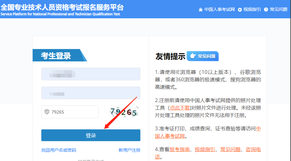 第二步,进入【全国专业技术人员资格考试报名服务平台】,输入账号,密码、验证码登录