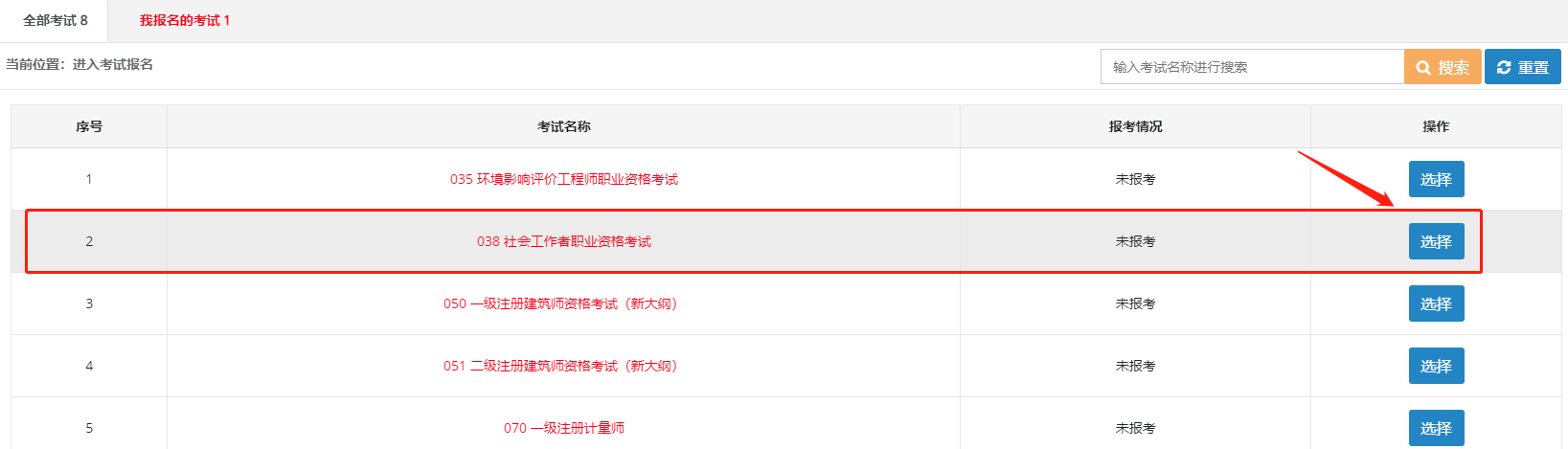 第四步:选择【038 社会工作者职业资格考试】